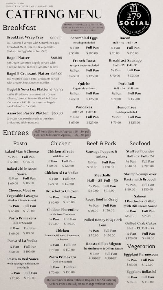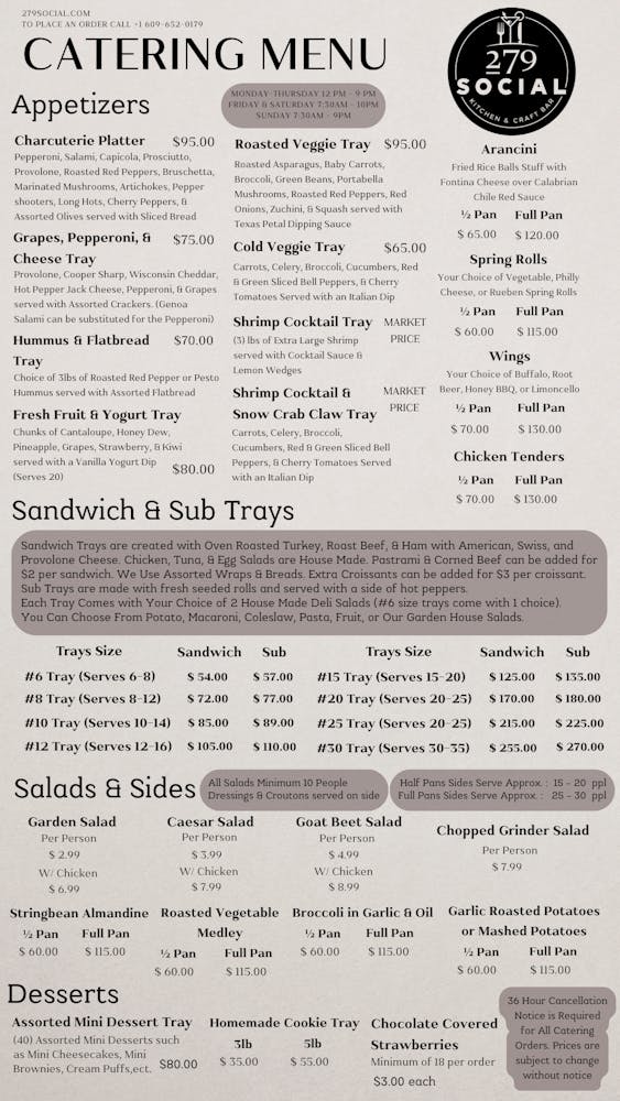 At our restaurant, we believe that every event is an opportunity to create unforgettable memories through extraordinary food and impeccable service. Whether you're planning an intimate gathering or a grand celebration, our team of culinary experts and event professionals is here to make your vision a reality. 279 Social Kitchen & Craft Bar has got you covered with our wide range of catering options. From delicious breakfast, lunch, and dinner choices to delectable sandwich trays, hot entrees, and more. Plus, we offer cookie trays, charcuterie, and salads for your office parties. Let us bring our mouthwatering flavors to your next gathering!